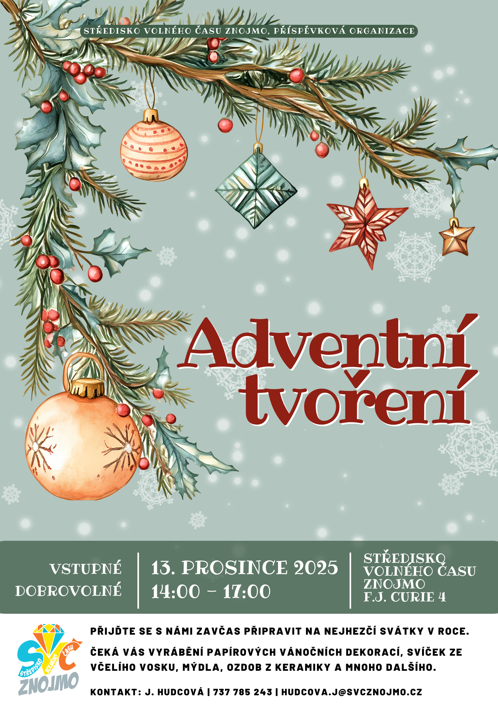 Adventní tvoření už tuto sobotu 13. 12. 2025 u nás na SVČ.
