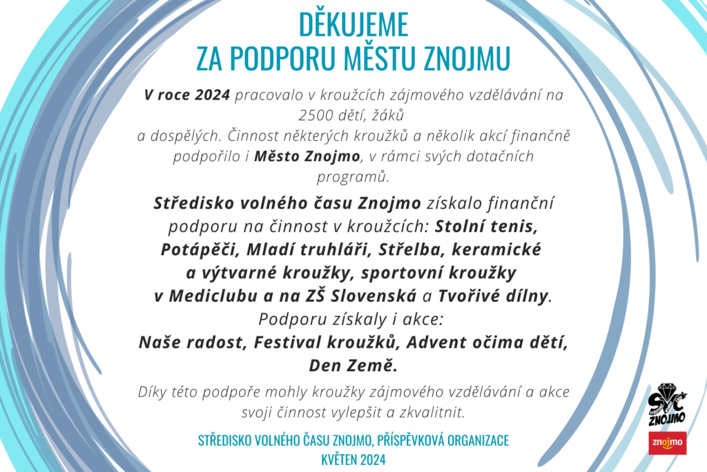 V roce 2024 pracovalo v kroužcích zájmového vzdělávání na 2500 dětí, žáků a dospělých. Činnost některých kroužků a několik akcí finančně podpořilo i Město Znojmo, v rámci svých dotačních programů. Středisko volného času Znojmo získalo finanční podporu na činnost v kroužcích: Stolní tenis, Potápěči, Mladí truhláři, Střelba, keramické a výtvarné kroužky, sportovní kroužky v Mediclubu a na ZŠ Slovenská a Tvořivé dílny. Podporu získaly i akce: Naše radost, Festival kroužků, Advent očima dětí, Den Země. Díky této podpoře mohly kroužky zájmového vzdělávání a akce svoji činnost vylepšit a zkvalitnit. Středisko volného času Znojmo, příspěvková organizace