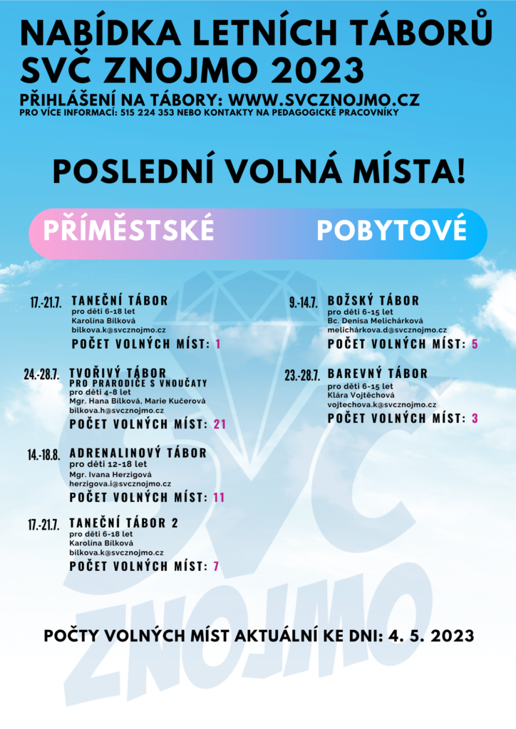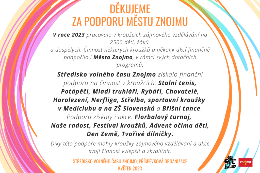 V roce 2023 pracovalo v kroužcích zájmového vzdělávání na 2500 dětí, žáků a dospělých. Činnost některých kroužků a několik akcí finančně podpořilo i Město Znojmo, v rámci svých dotačních programů. Středisko volného času Znojmo získalo finanční podporu na činnost v kroužcích: Stolní tenis, Potápěči, Mladí truhláři, Rybáři, Chovatelé, Horolezení, Nerfliga, Střelba, sportovní kroužky v Mediclubu a na ZŠ Slovenská a Břišní tance. Podporu získaly i akce: Florbalový turnaj, Naše radost, Festival kroužků, Advent očima dětí, Den Země, Tvořivé dílničky. Díky této podpoře mohly kroužky zájmového vzdělávání a akce svoji činnost vylepšit a zkvalitnit.