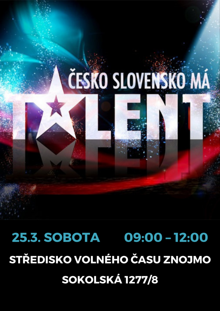 Chcete být součástí fenomenální show Česko Slovensko má talent? Neváhejte a přihlaste se do 11. ročníku této slavné soutěže!Casting do soutěže bude probíhat tuto sobotu 25. 3. 2023 u nás ve Středisku volného času Znojmo, a to na hlavní budově Sokolská 1277/8 v čase 9:00-12:00.