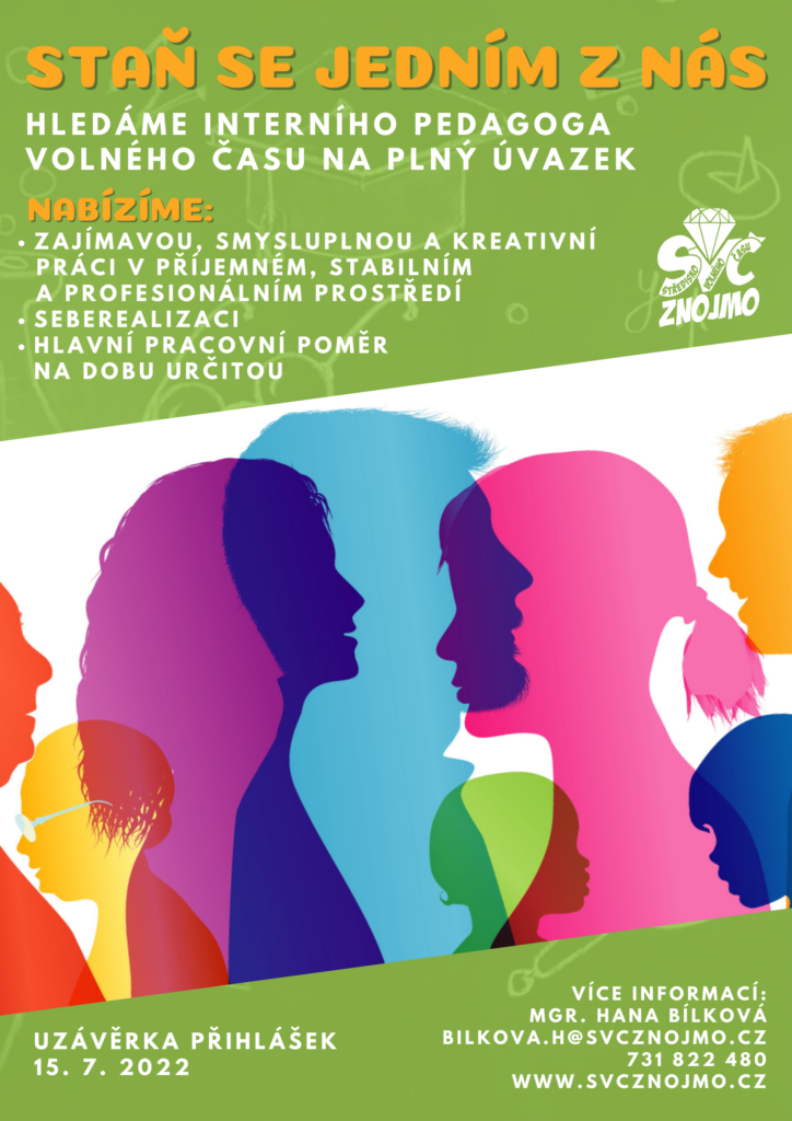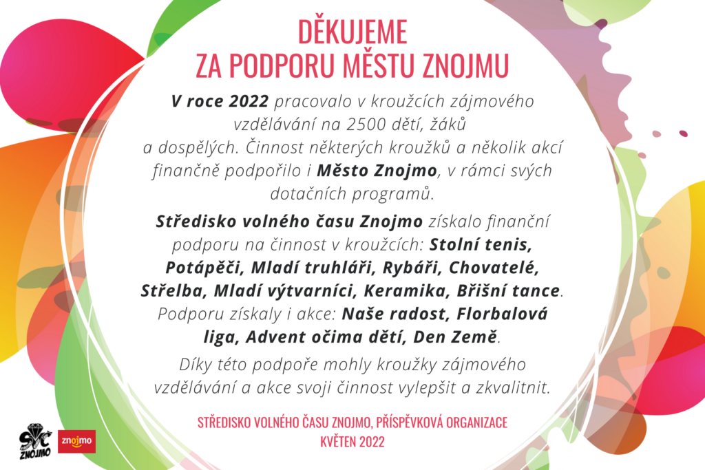 Věděli jste, že rodiče v nepříznivé životní situaci mohou získat od města Znojma příspěvek ve výši až 1 600 korun na zájmové aktivity svého dítěte? Pokud ne, prostudujte si přiložené materiály a využijte této možnosti. Pro více informací kontaktujte přímo Odbor školství, kultury a památkové péče města Znojma, Bc. Romana Moravčíková a Hana Králová. Kroužek pro každé dítě - pravidla zde Kroužek pro každé dítě - formulář zde