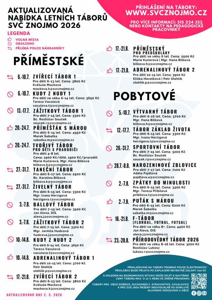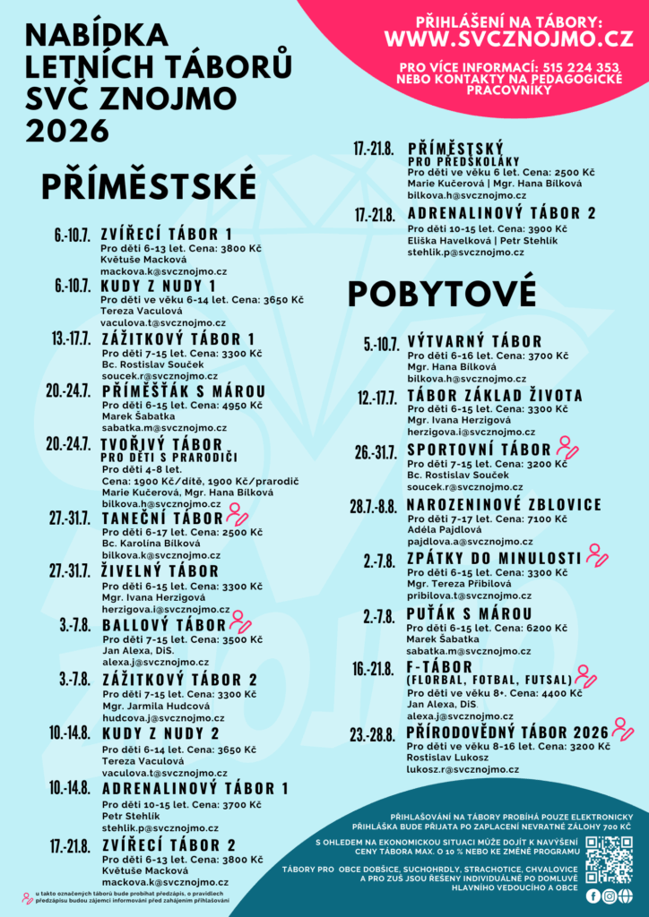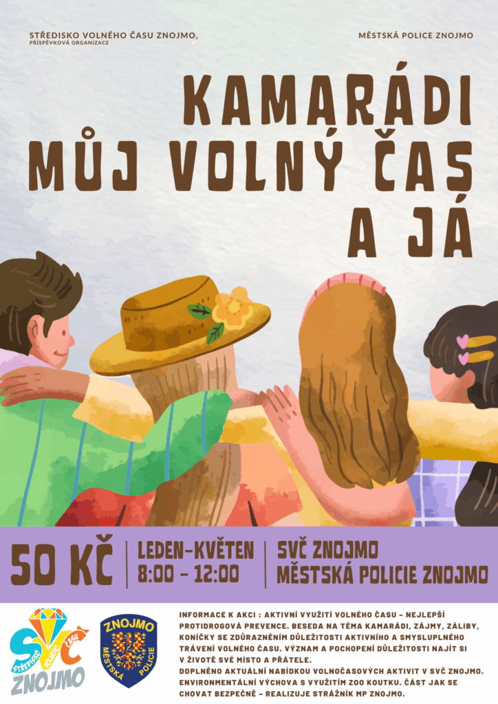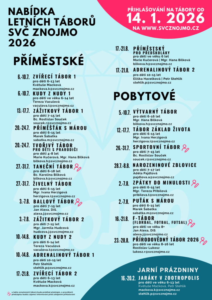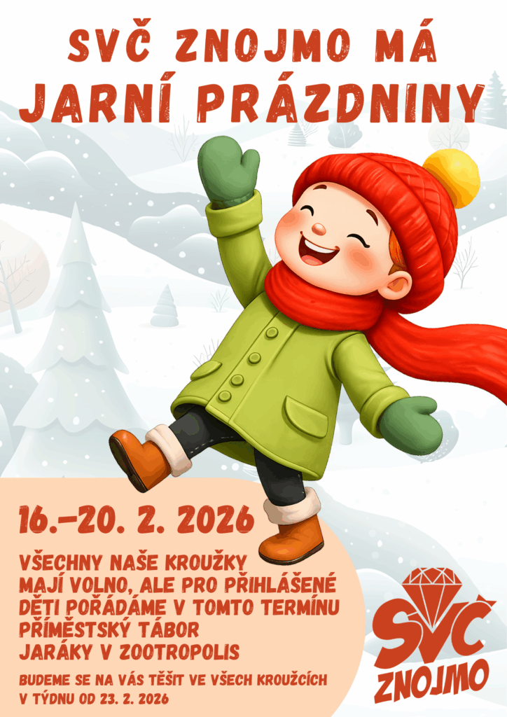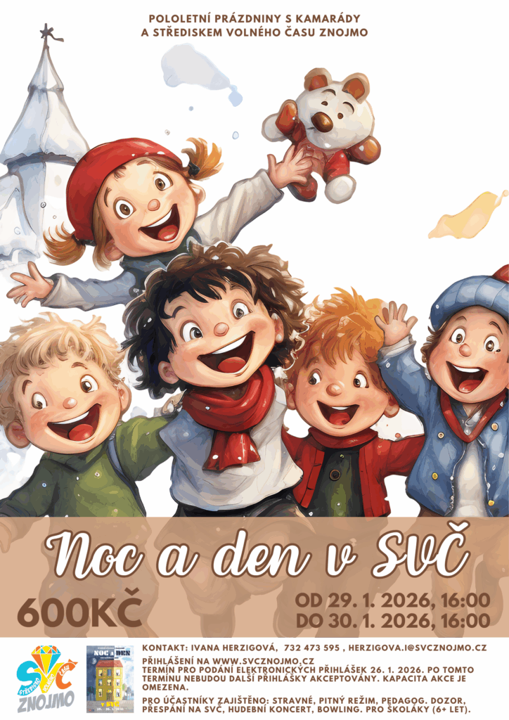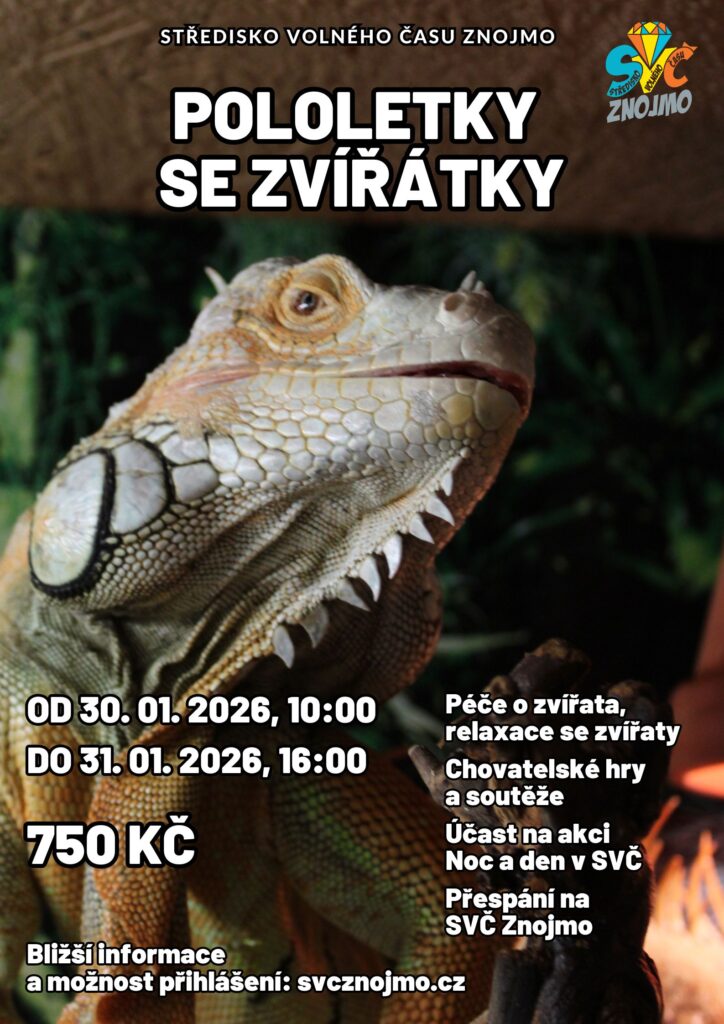 Pololetky se zvířátky- od pátku 30. 01. 2026 10:00 hod.- do soboty 31. 01. 2026 16:00 hod. Máte doma malého (nebo i trochu většího) milovníka zvířátek? Tak přesně pro něj chystáme další akční přespávačku!Na programu bude návštěva ZOO koutku, péče o zvířata, relaxace se zvířaty. Chovatelské hry a soutěže, společenské hry. Odpolední a večerní film. Účast na akci Noc a den v SVČ. Přespání na SVČ Znojmo. Samozřejmostí je celodenní stravování a pitný režim. Na další společný víkend plný nových zážitků, smíchu a pohody se těší Rosťa, Adélka, Víťa a Verča. Bližší informace a možnost přihlášení (prostřednictvím klientského účtu) zde