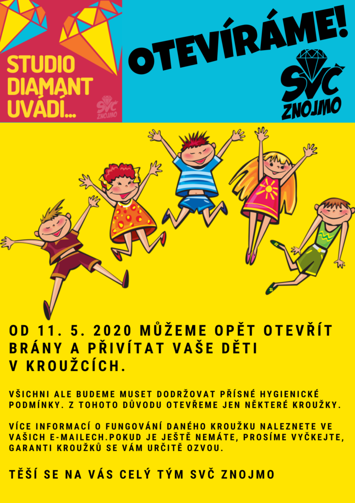 Dobrý den, milí rodiče patrně jste již zaregistrovali dobrou zprávu týkající se zájmového vzdělávání. Od 11. 5. 2020 můžeme opět otevřít brány a přivítat vaše děti v kroužcích. Samozřejmě za přísných hygienických podmínek. Z tohoto důvodu otevřeme jen některé kroužky. Více informací budeme posílat do emailů a postupně přidávat na web. Děkujeme za pochopení a těšíme se na Vaše děti. Tým SVČ Znojmo Podmínky účasti dítěte v kroužku jsou uvedeny v dokumentu vydaném MŠMT: Informace pro rodiče OCHRANA ZDRAVÍ A PROVOZ STŘEDISEK VOLNÉHO ČASU V OBDOBÍ DO KONCE ŠKOLNÍHO ROKU 2019 Dále je třeba na první schůzku přinést podepsané následující prohlášení,…