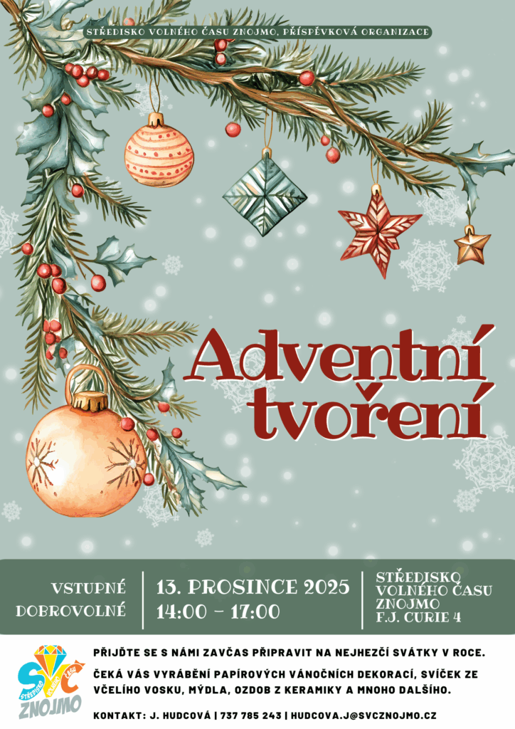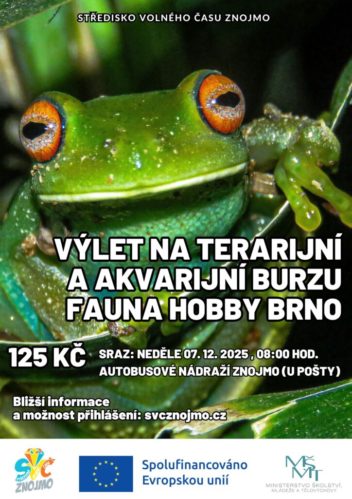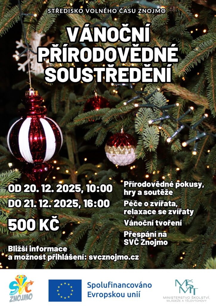 Vánoční přírodovědné soustředění- od soboty 20. 12. 2025 10:00 hod.- do neděle 21. 12. 2025 16:00 hod. Další víkendová přespávačka je tady! Čeká na nás tradiční setkání plné přírodovědných pokusů, her, soutěží a samozřejmě i péče o naše zvířecí svěřence. Tentokrát ale přidáme i pořádnou dávku Vánoc – tvoření, tradice a sváteční atmosféra! Na společný víkend plný zážitků, smíchu a zvířecího mazlení se těší Rosťa, Adélka, Víťa a Verča. Bližší informace a možnost přihlášení (prostřednictvím klientského účtu) zde. Akce je podpořena projektem “SVČ Znojmo - Diamant”, který je realizován v rámci Operačního programu Jan Amos Komenský.