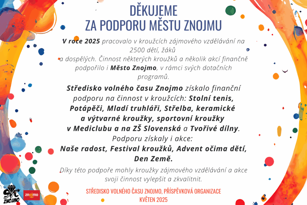 V roce 2025 pracovalo v kroužcích zájmového vzdělávání na 2500 dětí, žáků a dospělých. Činnost některých kroužků a několik akcí finančně podpořilo i Město Znojmo, v rámci svých dotačních programů. Středisko volného času Znojmo získalo finanční podporu na činnost v kroužcích: Stolní tenis, Potápěči, Mladí truhláři, Střelba, keramické a výtvarné kroužky, sportovní kroužky v Mediclubu a na ZŠ Slovenská a Tvořivé dílny. Podporu získaly i akce: Naše radost, Festival kroužků, Advent očima dětí, Den Země. Díky této podpoře mohly kroužky zájmového vzdělávání a akce svoji činnost vylepšit a zkvalitnit. Středisko volného času Znojmo, příspěvková organizace květen 2025